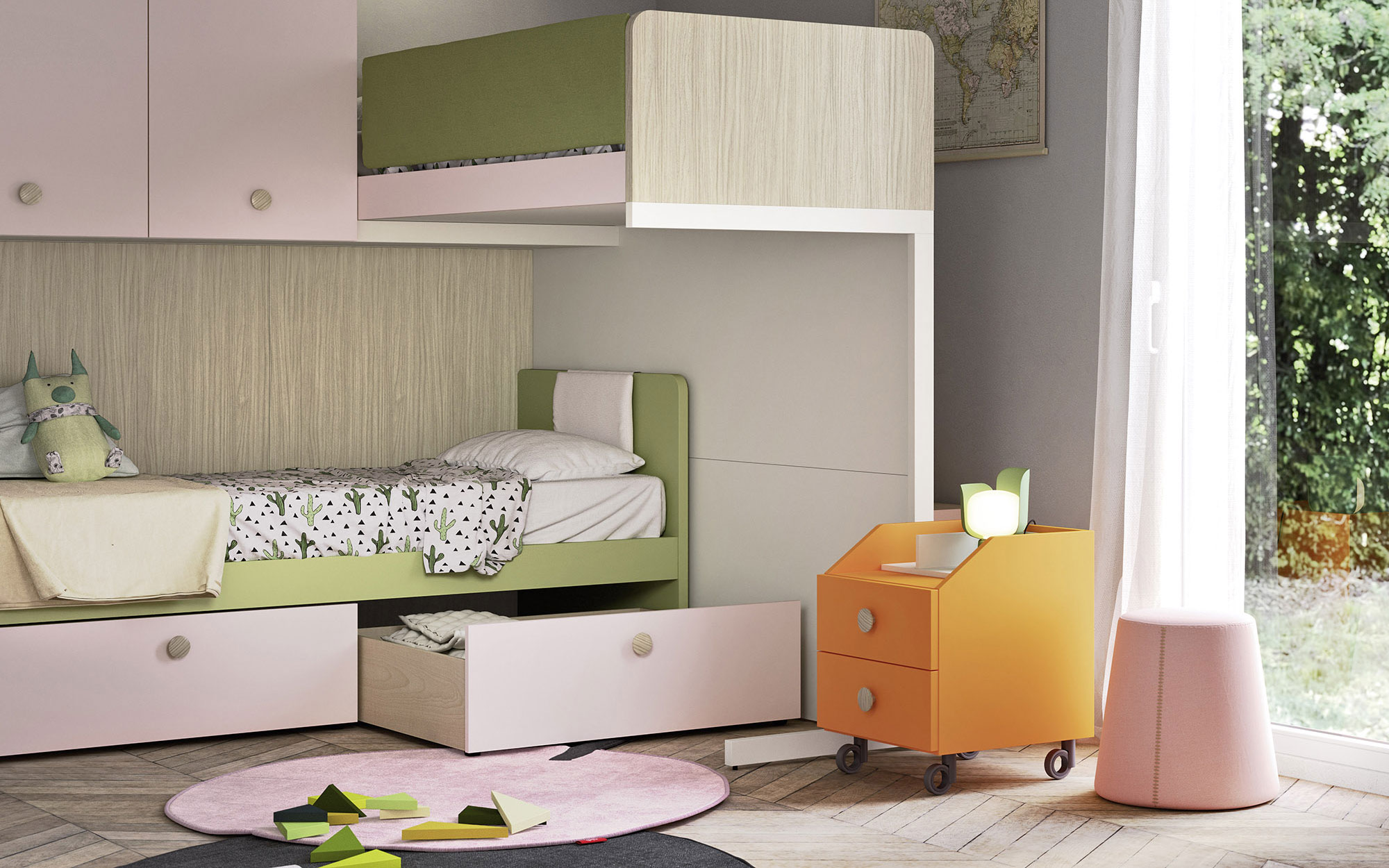 Letto singolo: resta la soluzione più classica e versatile, particolarmente indicata quando la stanza è piccola o quando deve essere condivisa da due fratelli. In questo caso, due letti singoli possono essere affiancati o disposti a L, oppure si può optare per un letto a castello, che libera spazio prezioso per altre attività.
